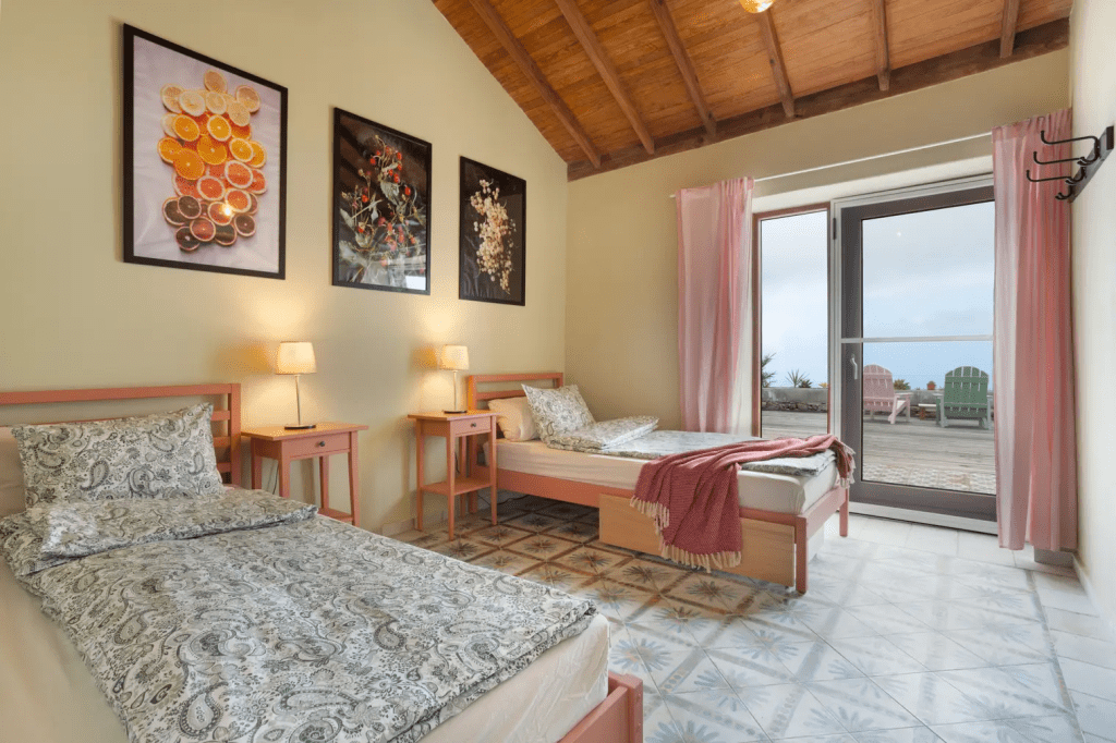 Our guests will be accommodated in the main house where there are four rooms, each one with two single beds and a private bathroom. The single beds can be made into one big bed if the need arises. We will accommodate up to eight people at the time.